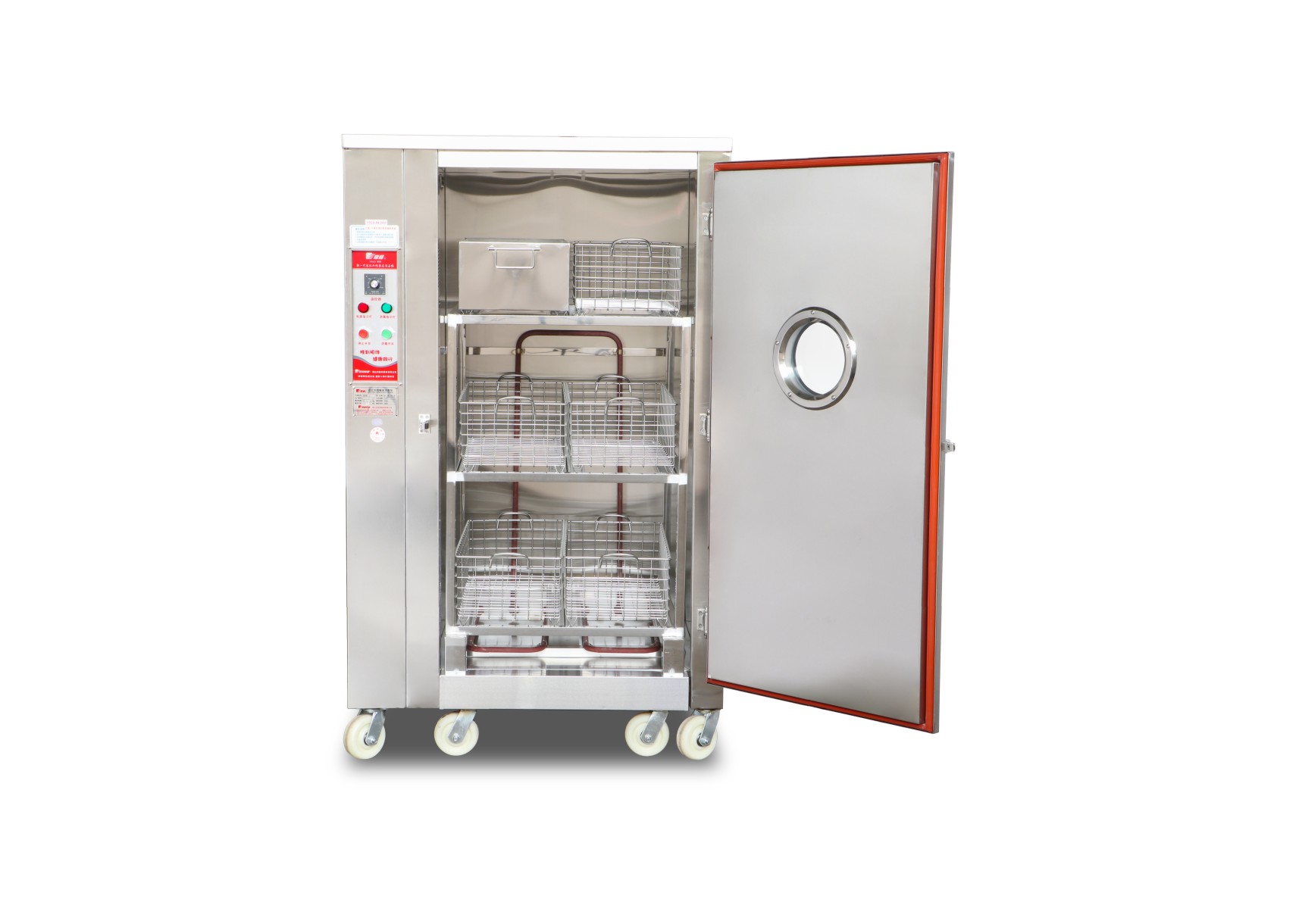 2.利用幹式高溫方法消毒,使經消毒的餐具沒有臭氧、蒸汽、紫外線消毒等方法難免的殘留水漬,集餐具消毒與烘幹及無菌儲存等功能於一身。