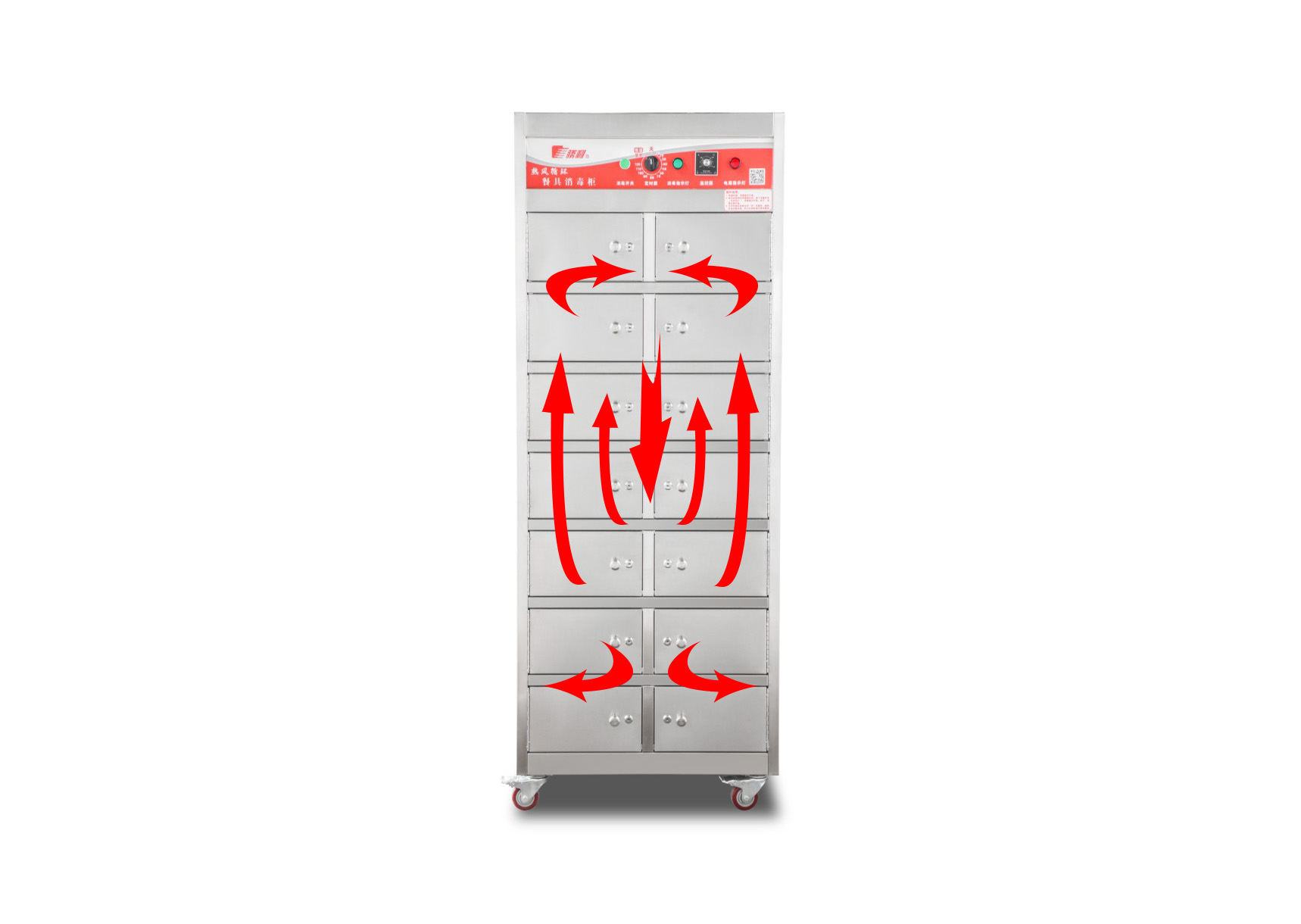 ● 分隔式遠紅外線熱風循環餐具消毒櫃采用遠紅外線金屬電熱管加熱、熱風循環、加熱速度快,溫度均勻,省電。